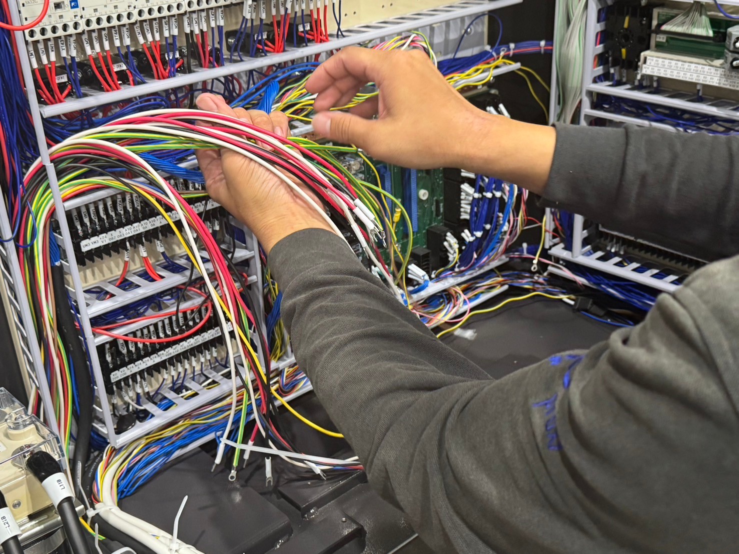 モノづくりに欠かせない工作機械。その大きな工作機械を動かし、指示、命令を出す制御盤(せいぎょばん)の部品の組付けや配線などをお願いします。ねじ締めや圧着(あっちゃく)、はんだ付けなどの基本業務から丁寧に教えていきます。家ほどの大きな機械に電気が通って、動き出したときは感動しますよ!